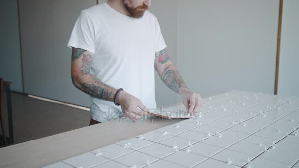 Tattooed Man Applies Ceramic Tiles On Kitchen Table Set By