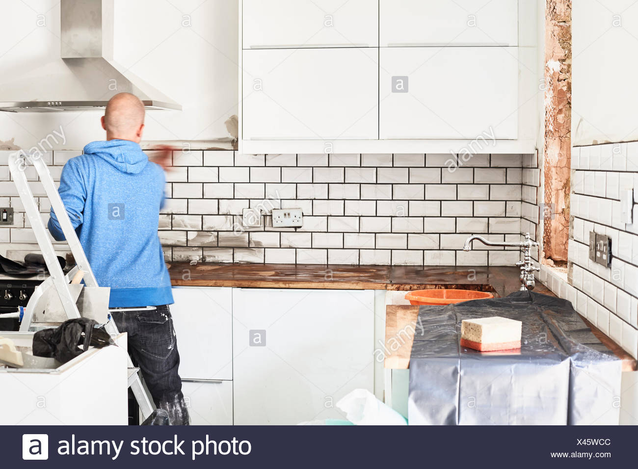 A Man Working In A New Kitchen A Tiler Applying Tiles To The Wall