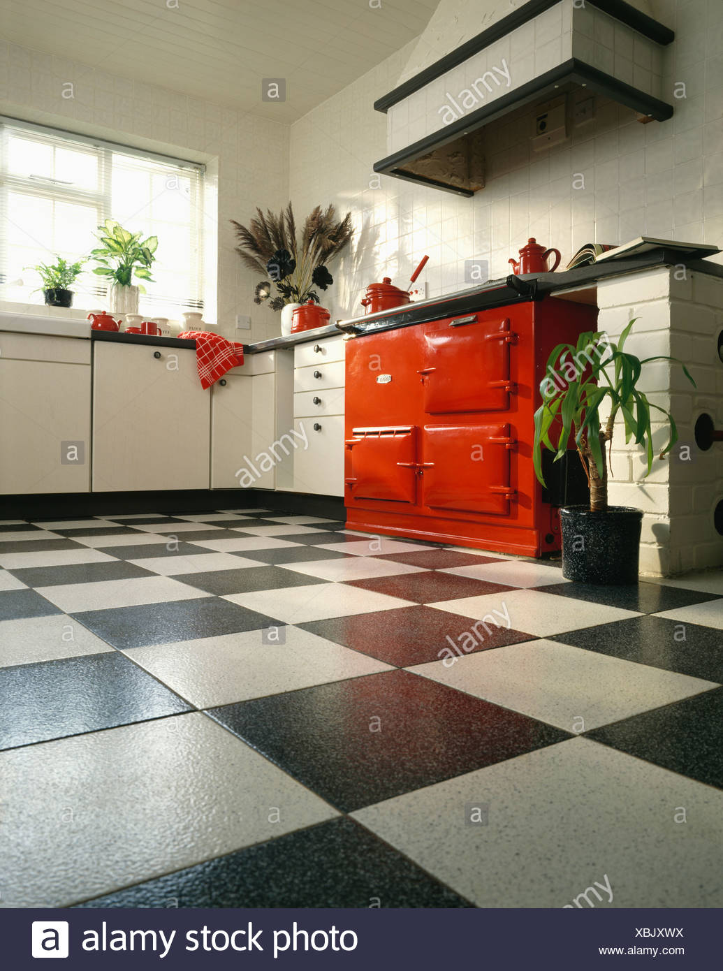 Red Aga Oven In White Kitchen With Black White Ceramic