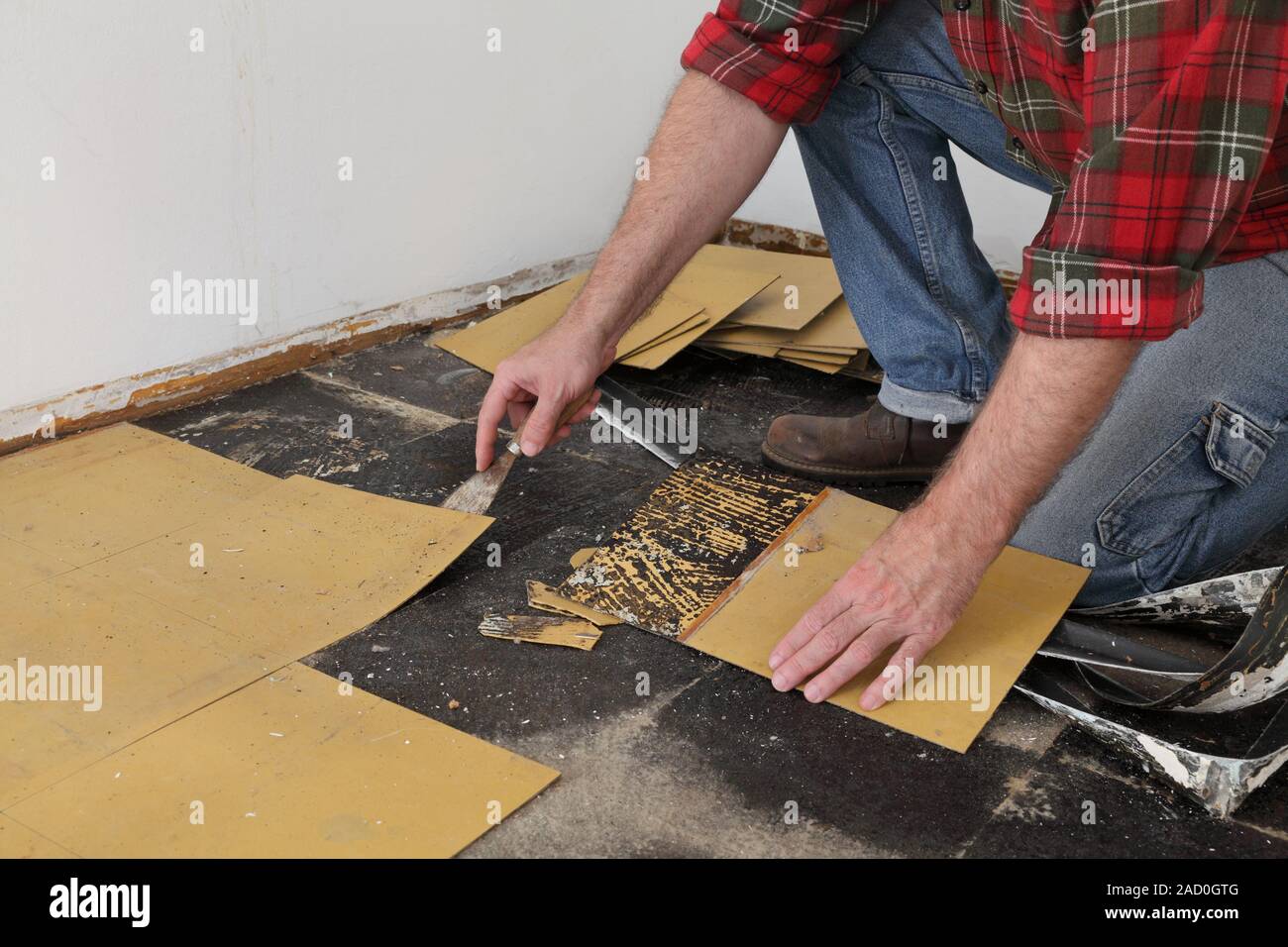 Old Vinyl Tiles Removal From Floor In A Kitchen Stock Photo