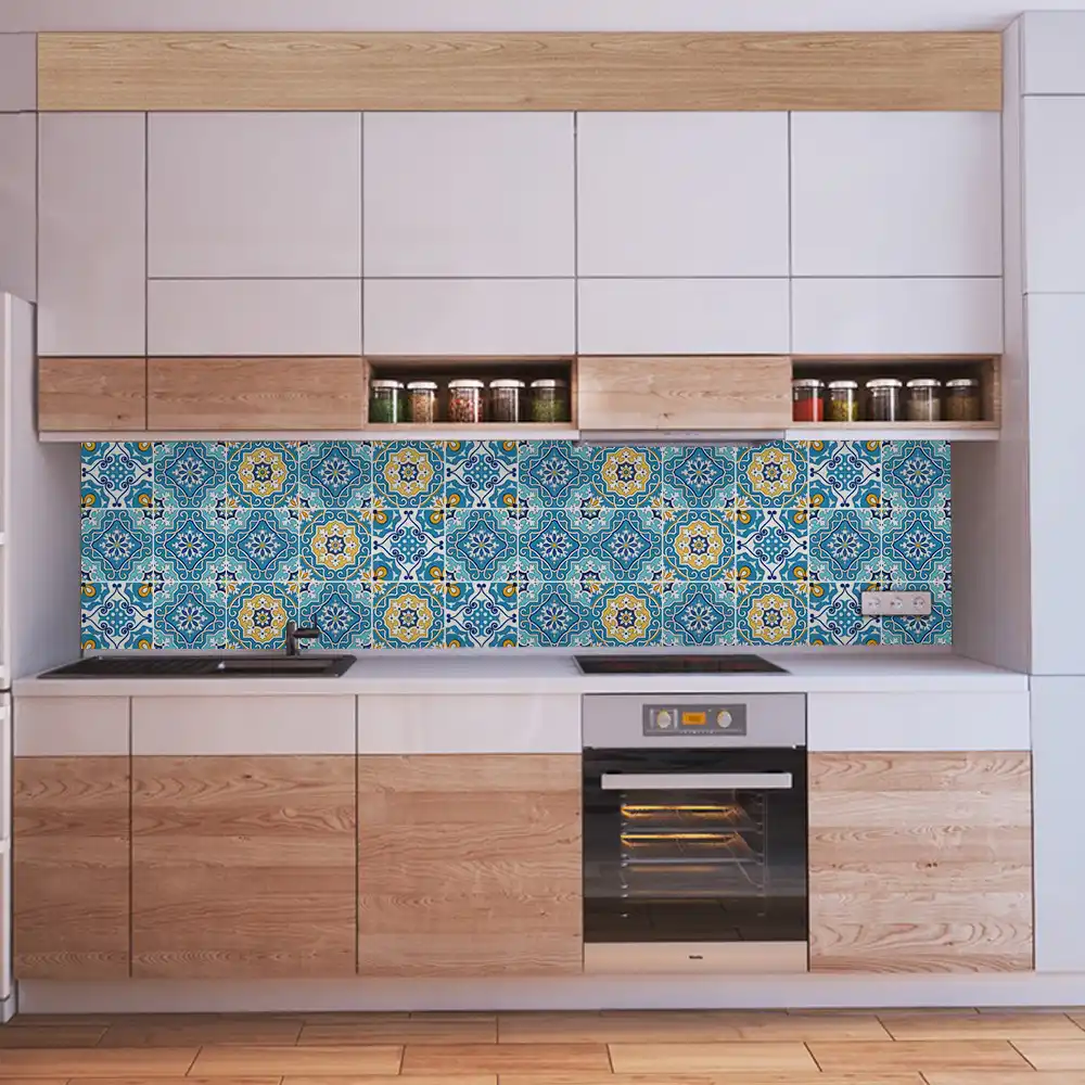 Buy moroccan blue dusk tile stickers kitchen and bathroom backsplash tile decal stair riser stickers peel and stick home pack of 44 8 x 8 inches. White kitchen with moroccan tile backsplash beneath the openshelves. These colorful tiles add personality and texture to any wall space.