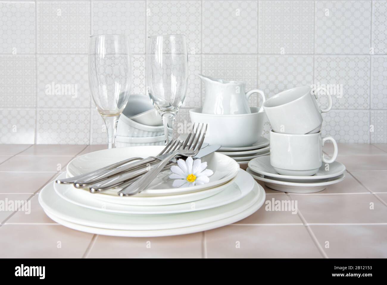Stack Of White Porcelain Plates Tea Cups And Wine Glasses On The
