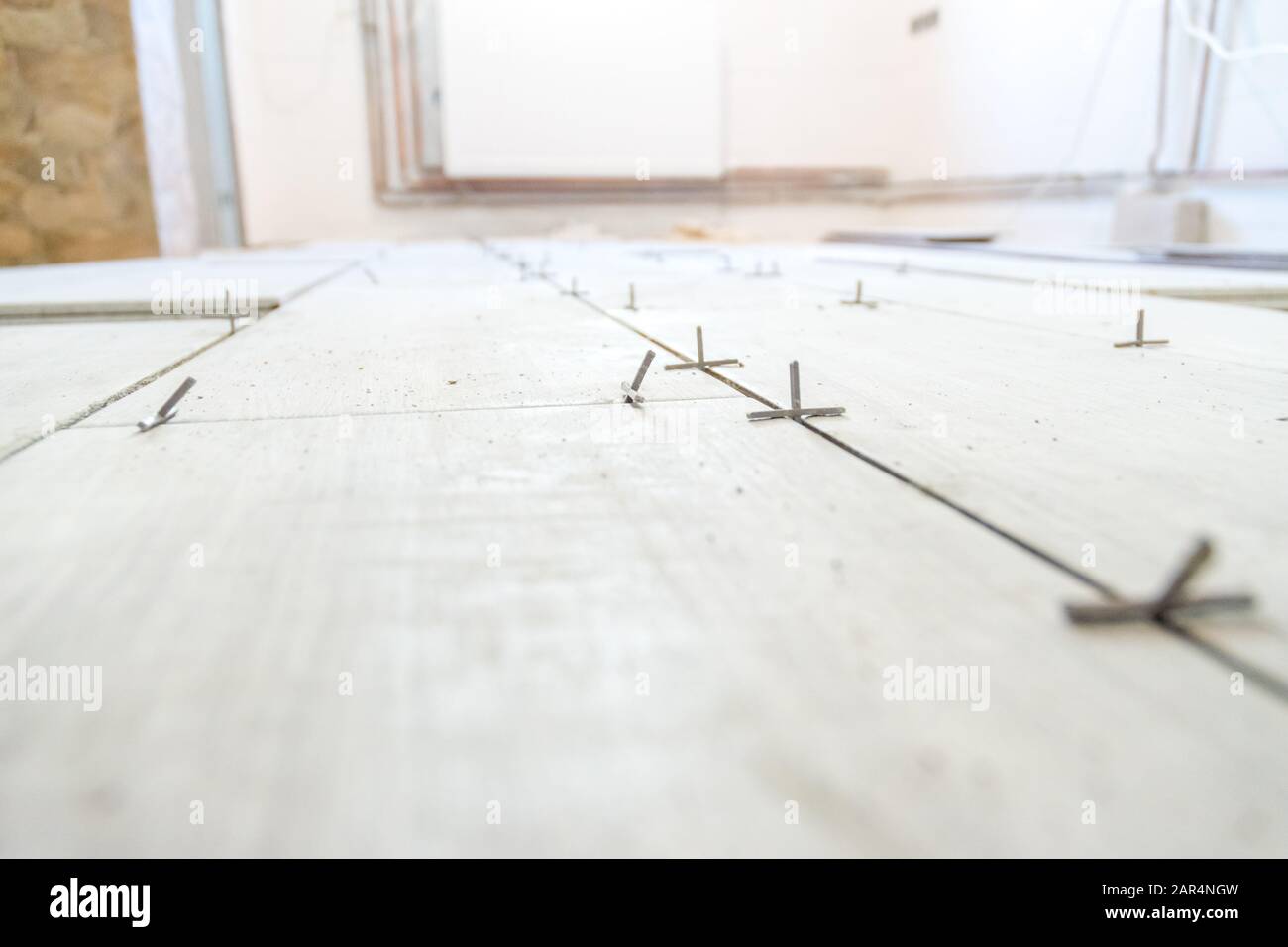 Close Up Shot Of Unfinished Floor Tiles Installation In Kitchen