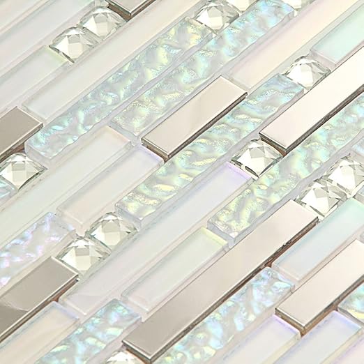 Wall Mosaic White Iridescent Tile Backsplash Silver Stainless