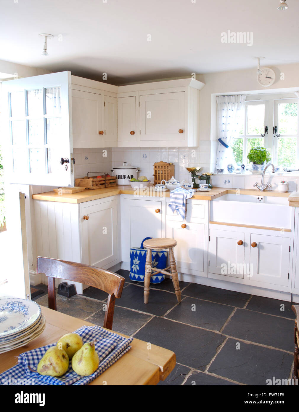 Slate Tiled Floor And Belfast Sink In White Cottage Kitchen Stock