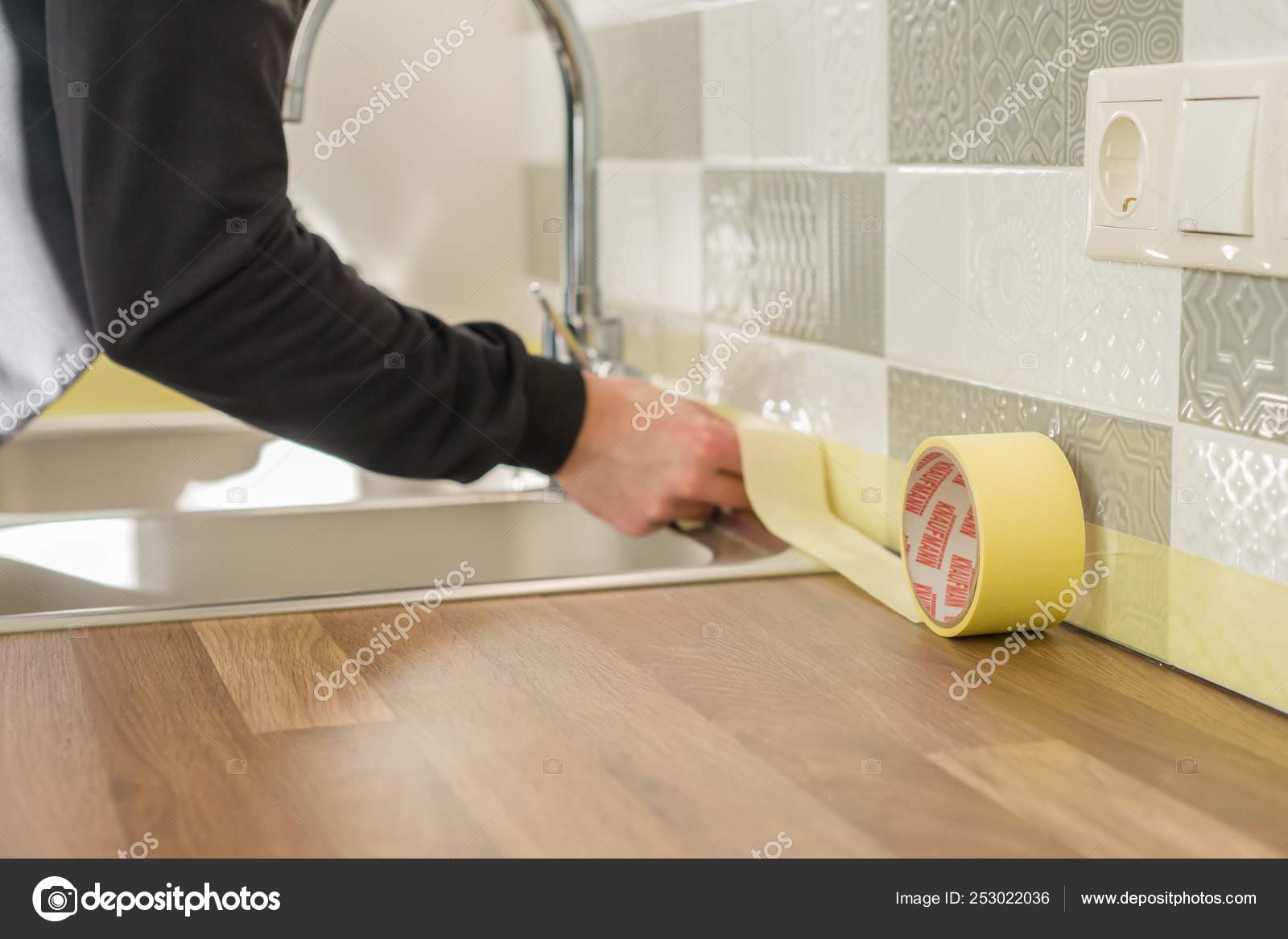 Close Up Of Hands Tiling A Kitchen Worktop Stock Photo 73954820