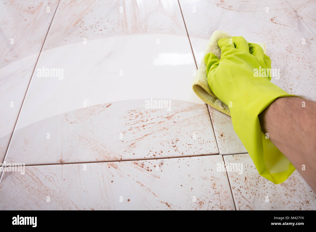 Close Up Of Hands In Rubber Gloves Scrubbing Kitchen Tiles Stock