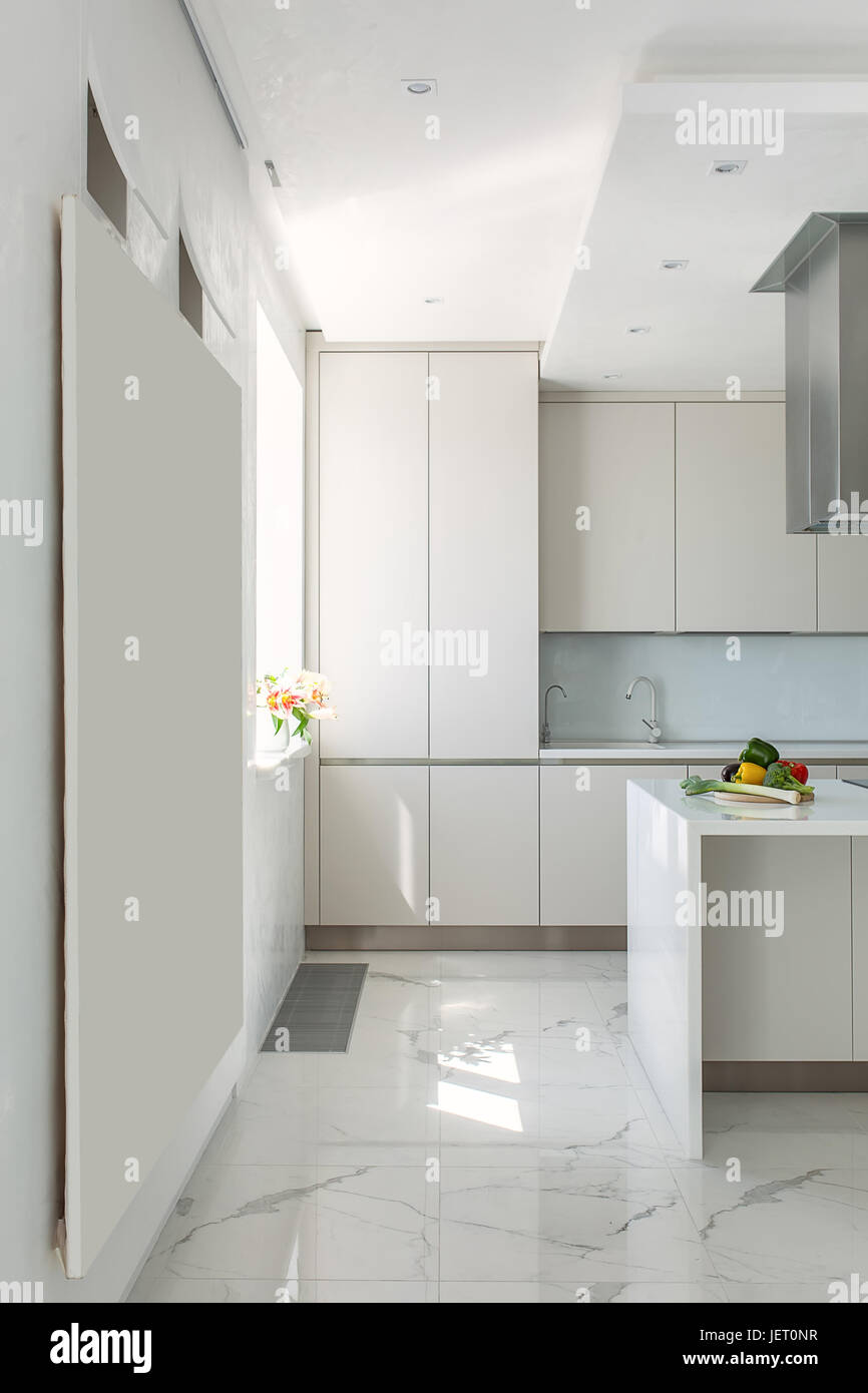 Modern Kitchen With White Walls And Light Tiled Floor There Are