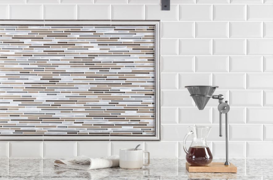 Roserosa peel and stick tile metal backsplash for kitchen wall tiles aluminum surface. Our kitchen tiles are perfect for adding a splash of colour and our patterned kitchen tiles are an alternative way to create a feature where a traditional splashback would sit. A beautiful kitchen in shades of brown with a stone backsplash and an inset center focal point of thin long tiles of charcoal and bronze.
