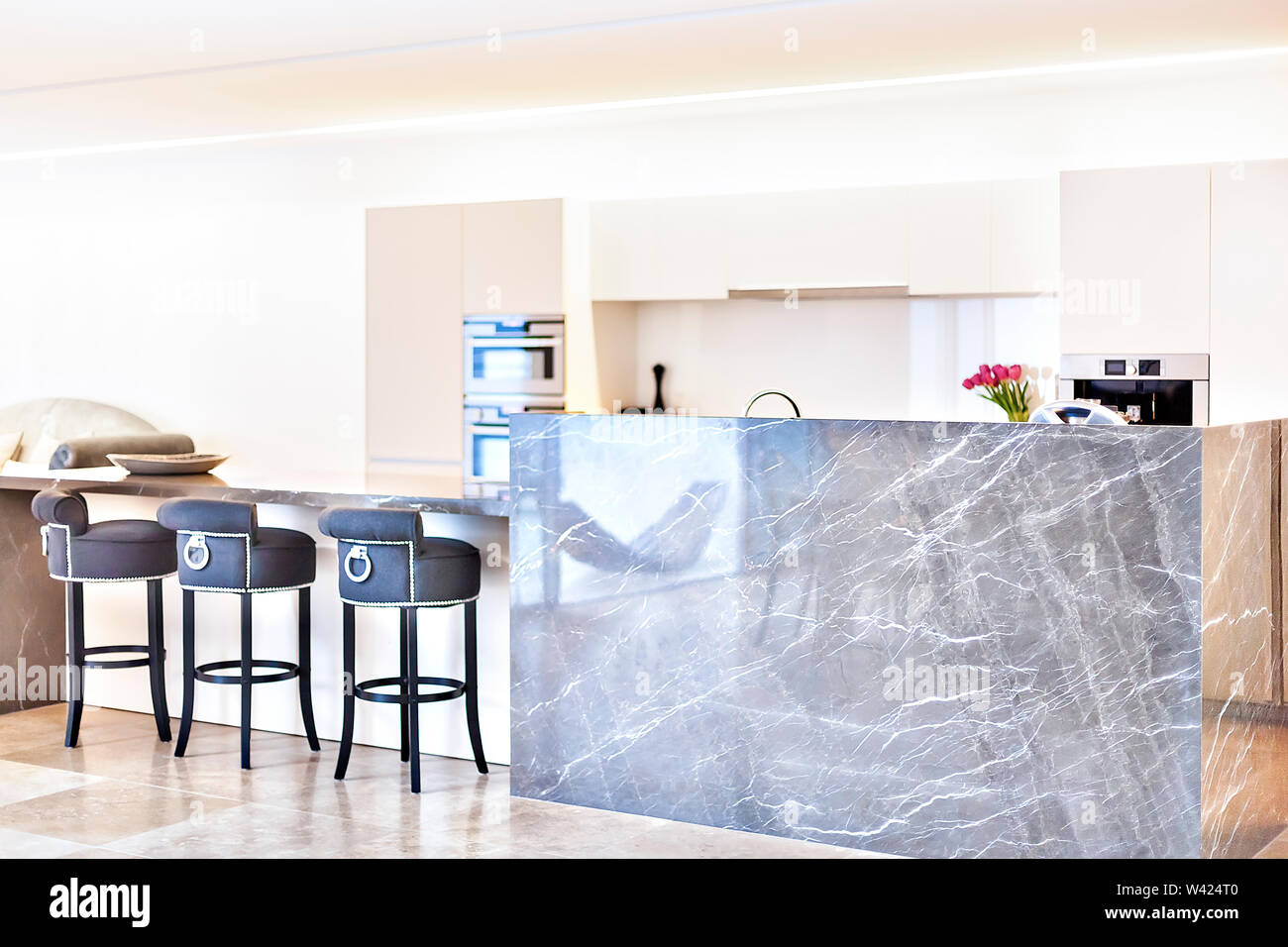 Luxury Kitchen Area On The Tile Floor With Black Chairs The