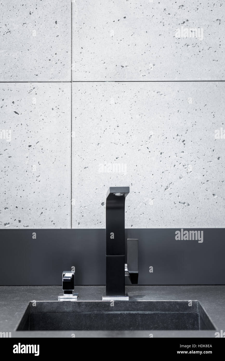 Black Kitchen Worktop Sink With Modern Tap And Grey Wall Tiles