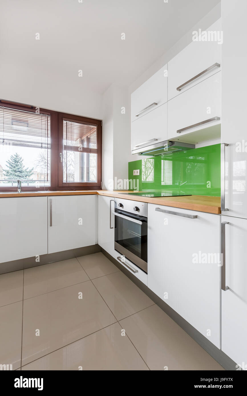 Kitchen With Modern White Furniture And Beige Floor Tiles Stock