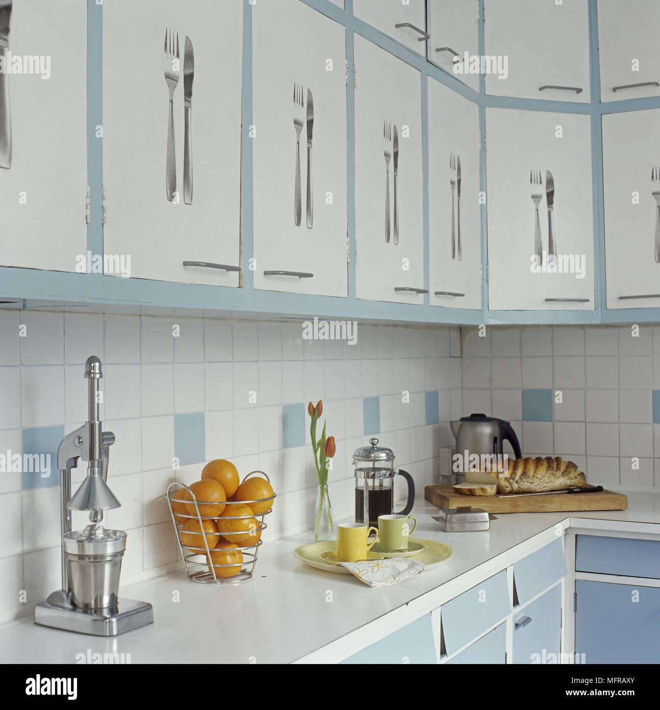 Kitchen With Blue And White Tiled Splashback And Fitted Units With